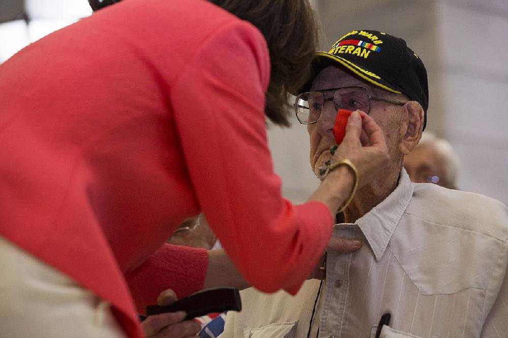 Kenneth Evans receives the French Legion of Honor Medal from Honorary French Consul Beatrice Moore during a ceremony with 11 other recipients at the state Capitol on Monday. The veterans were honored for their service to France in World War II.