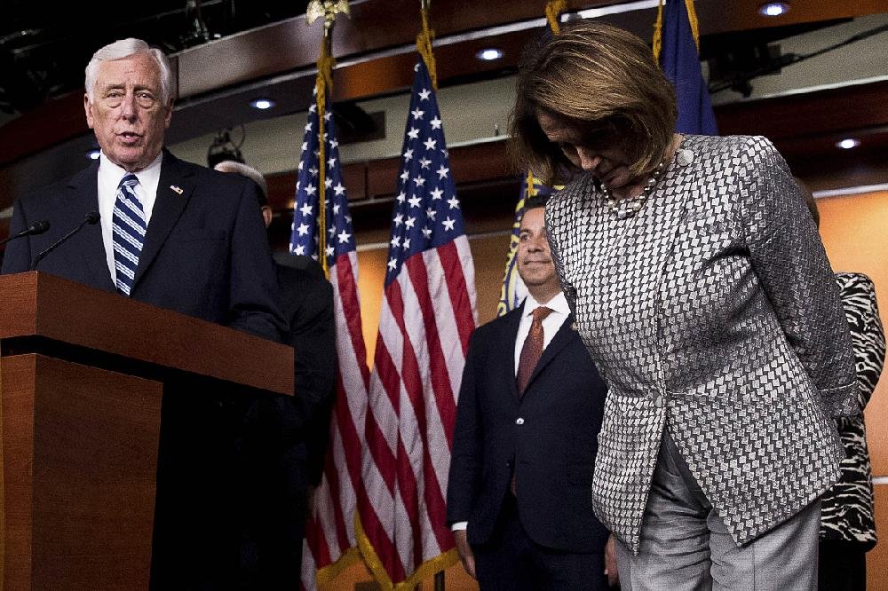 House Minority Whip Steny Hoyer (left), accompanied by House Minority Leader Nancy Pelosi and other Democrats, speaks Thursday after the health care bill passed in the House.